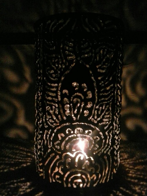 This gorgeous cut pattern was based off of a Mehndi henna pattern, which would lend an exotic look to the home. The photo shows some of the gorgeous shadows cast by the candle inside the can. This would look great as a table centerpiece. It was made by ManifeStnStudio at etsy.