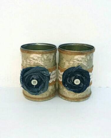 These are great all-purpose cans for display or holding items. Use them as centerpieces at events or to hold art brushes, pencils, makeup brushes or anything you can think of that will fit. The cans are covered with vintage-print scrapbook paper, twine trim, burlap lace and the handmade denim rose. You can find them from HomeMadeFunsies at etsy.