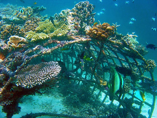 This method of creating artificial reefs is rather different, but is founded on materials that are as simple as a metal grid and old barrels. What is special about biorock is that it creates an extraordinary, accelerated growth of coral. By passing a small electrical current through the water around it, minerals are encouraged to accumulate on the structure’s surface for as long as the current lasts. In this way, extraordinary formations can be quickly created, as can be seen in Ari Spenhoff’s amazing pictures. Sources: 1, 2, 3