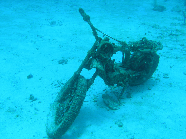 Oil was pumped out of the ship, on-board hazards were removed and the ship was eventually scuttled in November 1985. It now sits 82 feet below the waves and 426 feet from the shore, and has been described as one of the most photogenic wrecks in the Red Sea. The water around it is now thick with lionfish, lobsters, morays and Spanish dancers; further proof of the power of recycling — repurposing an unwanted wreck as a font of life!5. Motorcycle