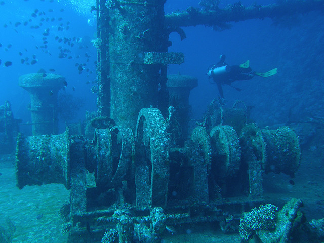 Although positioned as if ready to burst into action, the glory days of this motorcycle are of course over. As photographer Stephen Weir puts it: “An inglorious end to a faithful friend.” Sitting off the shores of the resort town of Akumal, Mexico, it’s not gathering dust, but instead is now covered in living coral and plankton. In fact, the 15-year-old formation is now one of the most popular local dives in the area.4. SS Thistlegorm